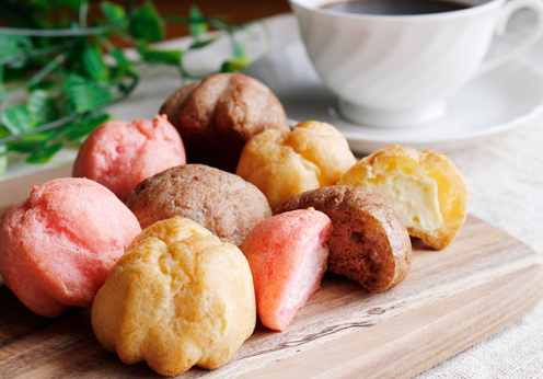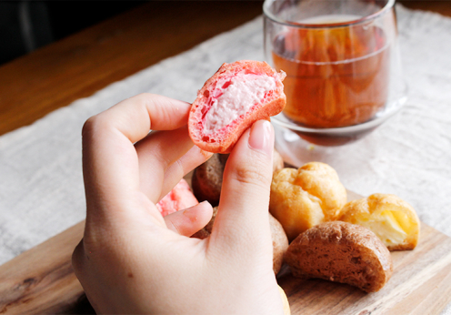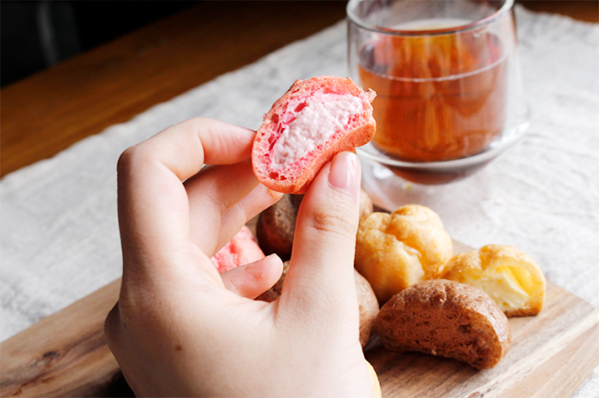 カスタードシューに、甘酸っぱいいちごジャムを混ぜ込みました。さらに、ホイップクリームを入れることで、まろやかな味わいに仕上げています。