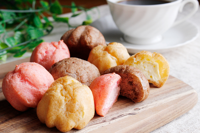 シュークリームスイーツバラエティーパックは、カスタード・チョコ・いちごの3種類をご用意しました。